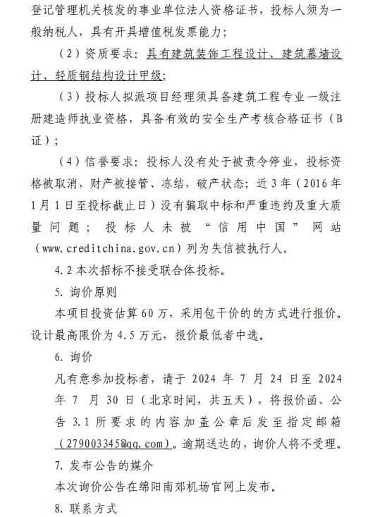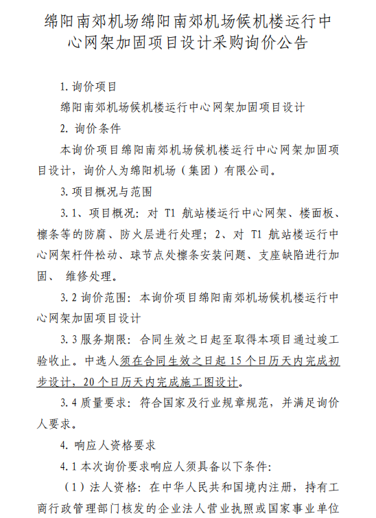 綿陽南郊機(jī)場(chǎng)綿陽南郊機(jī)場(chǎng)候機(jī)樓運(yùn)行中心網(wǎng)架加固項(xiàng)目設(shè)計(jì)采購詢價(jià)公告