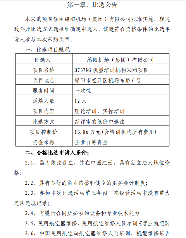 綿陽機(jī)場(chǎng)B737NG機(jī)型培訓(xùn)機(jī)構(gòu)采購項(xiàng)目比選公告